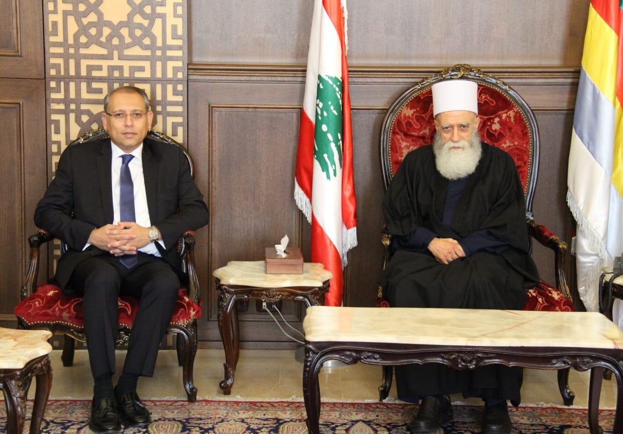 استقبل سماحة شيخ عقل طائفة الموحدين الدروز الشيخ نعيم حسن في دار الطائفة في بيروت السفير المصري في لبنان نزيه النجاري في …