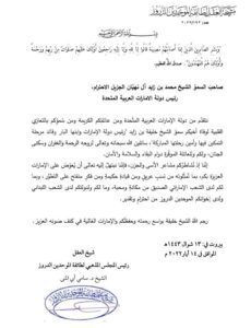 نتقدَّم من دولة الإمارات العربية المتَّحدة ومن عائلتِكم الكريمة ومن سُموِّكم بالتعازي القلبية لوفاة أخيكم سموّ الشيخ خليفة بن زايد “رئيس دولة الإمارات وابنها البار وقائد مرحلة التمكين فيها وأمين رحلتها المباركة”، سائلين الله سبحانه وتعالى لروحه الرحمة والغفران وسكنى الجنان، ولكم وللعائلة الموقّرة دوام البقاء والسلامة والأمان.